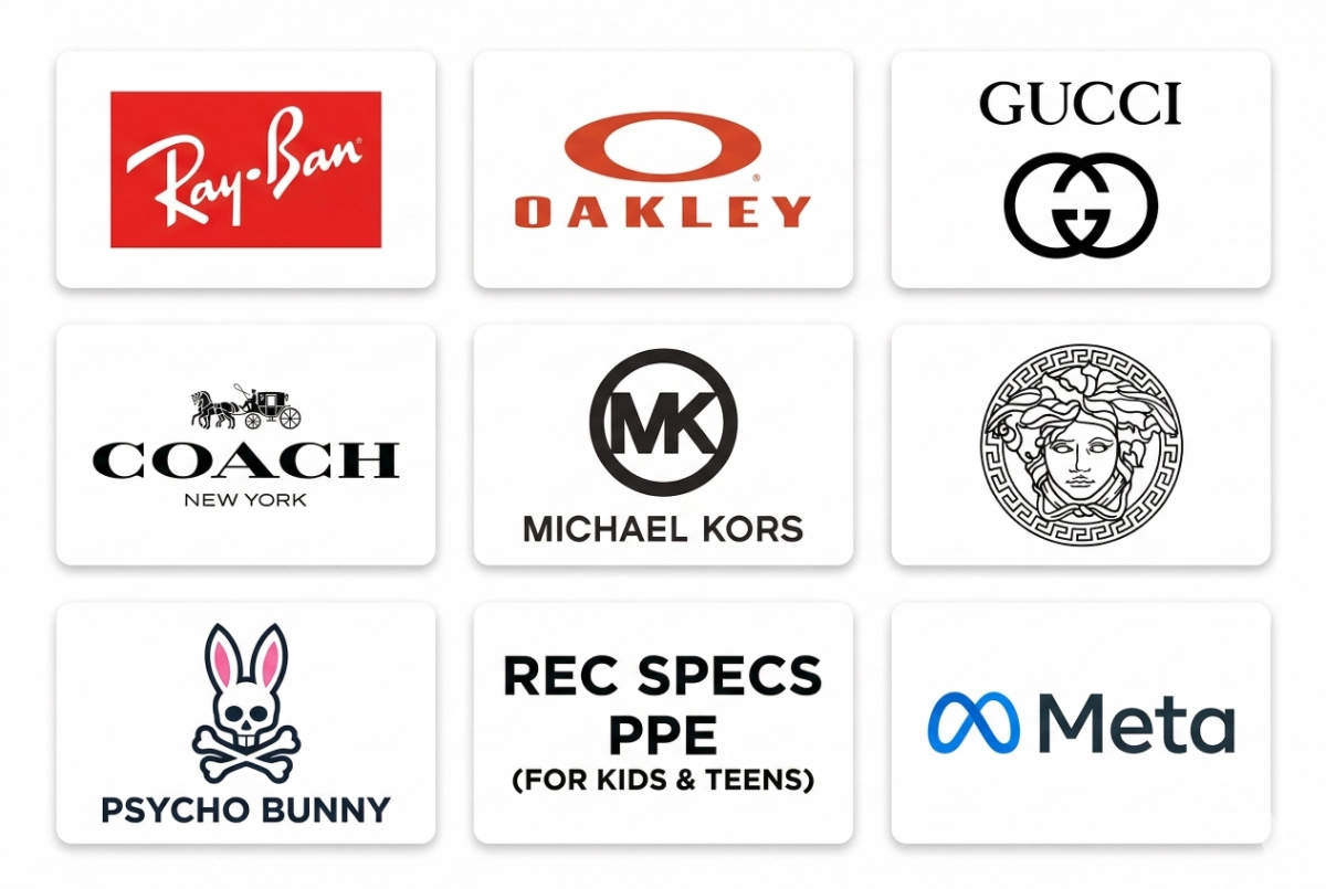 Ray-Ban, Oakley, Gucci, Coach, Michael Kors, Versace, Psycho Bunny, Rec Specs PPE (for kids and teens), and Meta.